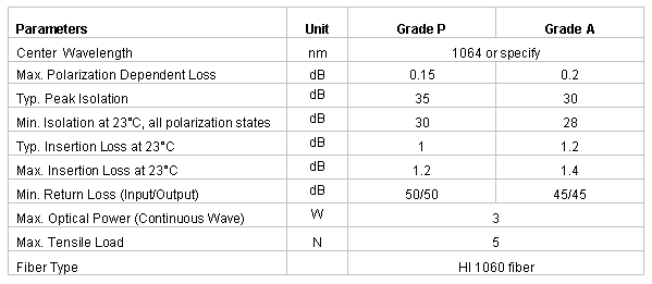 The High Power Polarization Insensitive Isolator is characterized with low insertion loss, high isolation, high power handling, high return loss, excellent environmental stability and reliability. It is ideal for fiber laser and instrumentation applications