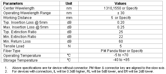 The PM Fiber Collimator is the basic element for in-line PM fiber optics components, such as PM isolator and PM DWDM. It has high extinction ratio, low insertion and high return loss. The unique processing and high quality AR coating also enable this collimator to handle high power. |